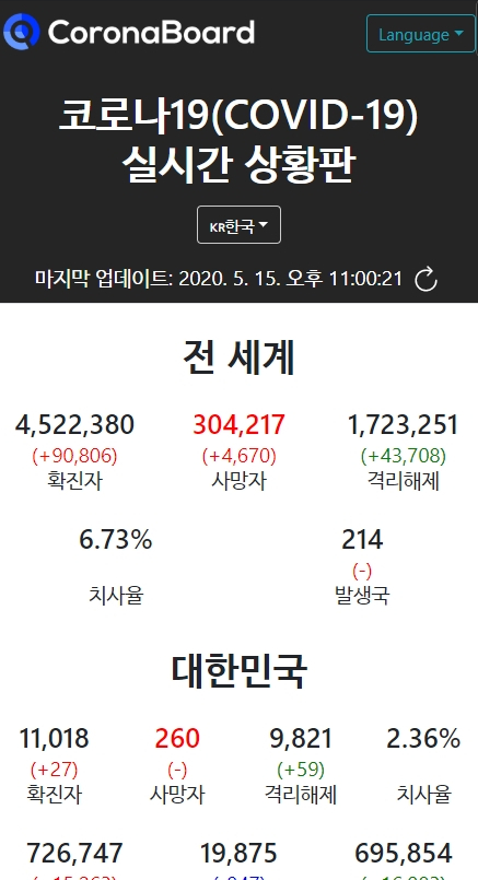 코로나 전세계 실시간 상황판