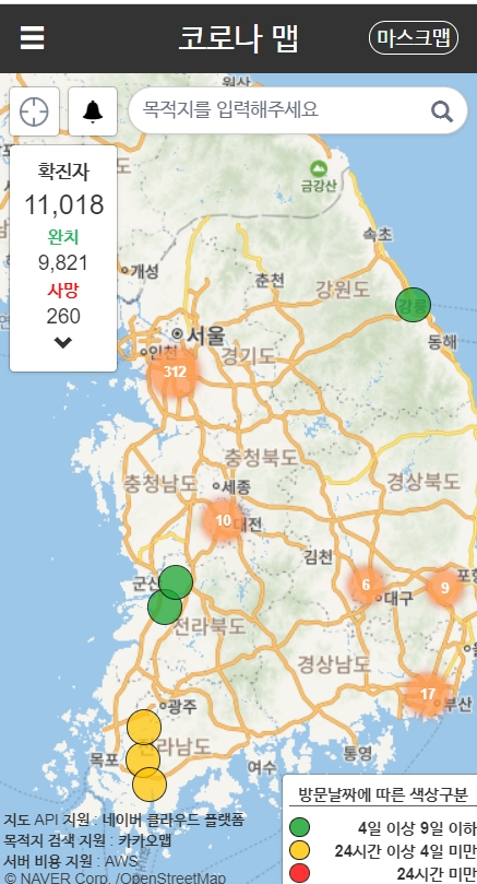 코로나맵 코로나바이러스의 국내 현황을 알려주는 지도 서비스입니다. 이용경로를 쉽게 확인할 수 있습니다.