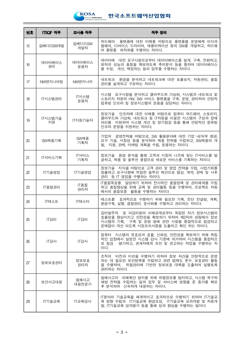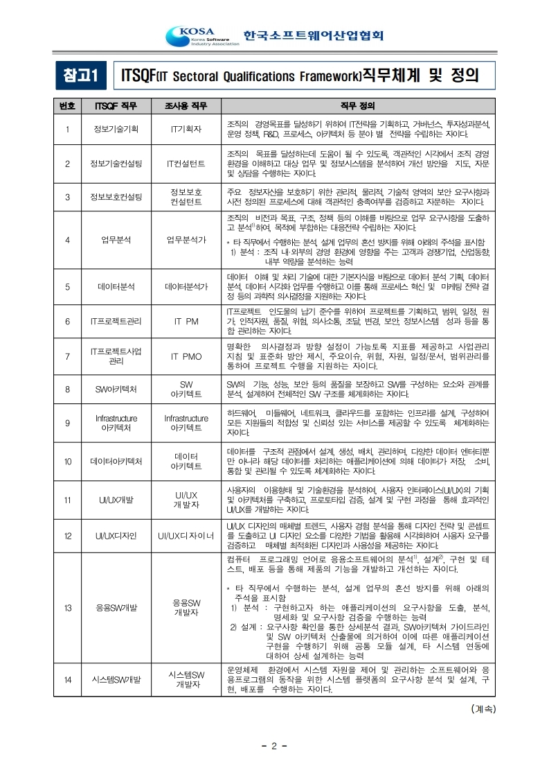 | 번호 | ITSQF 직무 | 조사용 직무 | 직무 정의 |