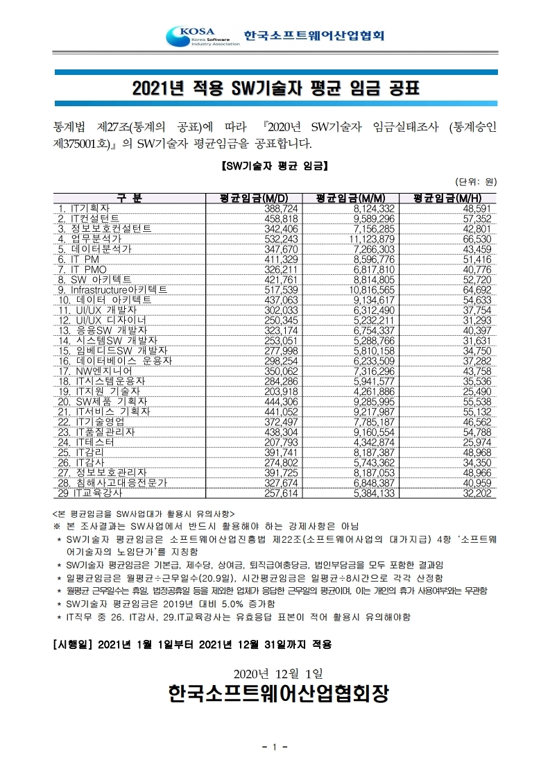 2021년도 적용 소프트웨어기술자 노임단가